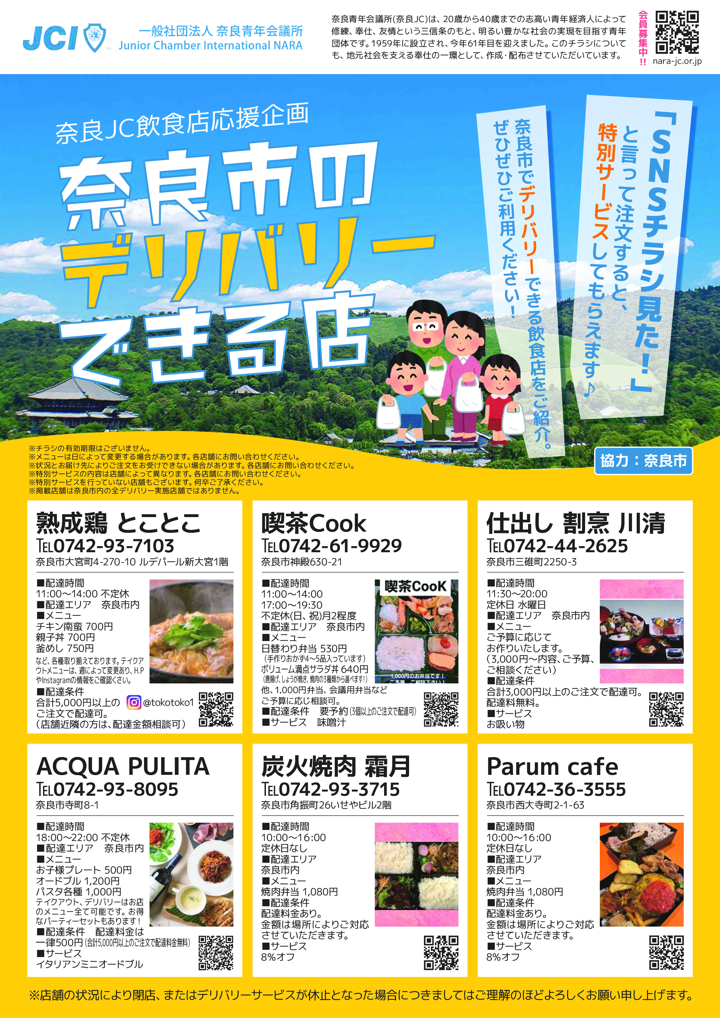 新型コロナウイルス対策事業④ 飲食店デリバリーチラシを作成しました http://www.nara-jc.or.jp/news/%e6%96%b0%e5%9e%8b%e3%82%b3%e3%83%ad%e3%83%8a%e3%82%a6%e3%82%a4%e3%83%ab%e3%82%b9%e5%af%be%e7%ad%96%e4%ba%8b%e6%a5%ad%e2%91%a3%e3%80%80%e9%a3%b2%e9%a3%9f%e5%ba%97%e3%83%87%e3%83%aa%e3%83%90%e3%83%aa Tue, 08 Sep 2020 08:40:49 +0000 http://www.nara-jc.or.jp/?post_type=news&p=4906 本年度は新型コロナウイルス感染症が猛威を振るい、経済に深刻なダメージを受けました。