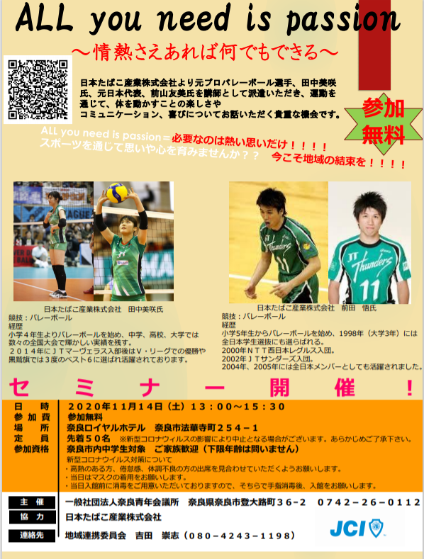 奈良青年会議所では、青少年事業「ALL you need is passion」と題し、日本たばこ産業株式会社からプロバレーボールプレイヤーとして活躍された、田中美咲氏と前田悟氏をお招きし、中学生を対象にした講演事業を開催いたします。