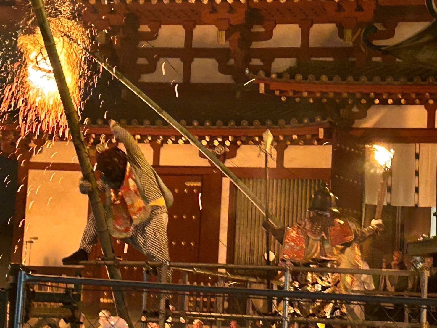 結願の法要では、⼤⾳声で悔過が唱えられ、⼤導師が最後の祈りを捧げる中、咒師(しゅし)は護摩を焚いて祈りを薬師三尊に届けます。そして結願法要終了後、⾦堂前で松明を持ち激しく暴れまわる⻤を薬師如来のお力を受けた毘沙門天が鎮める「鬼追い式」が行われます。