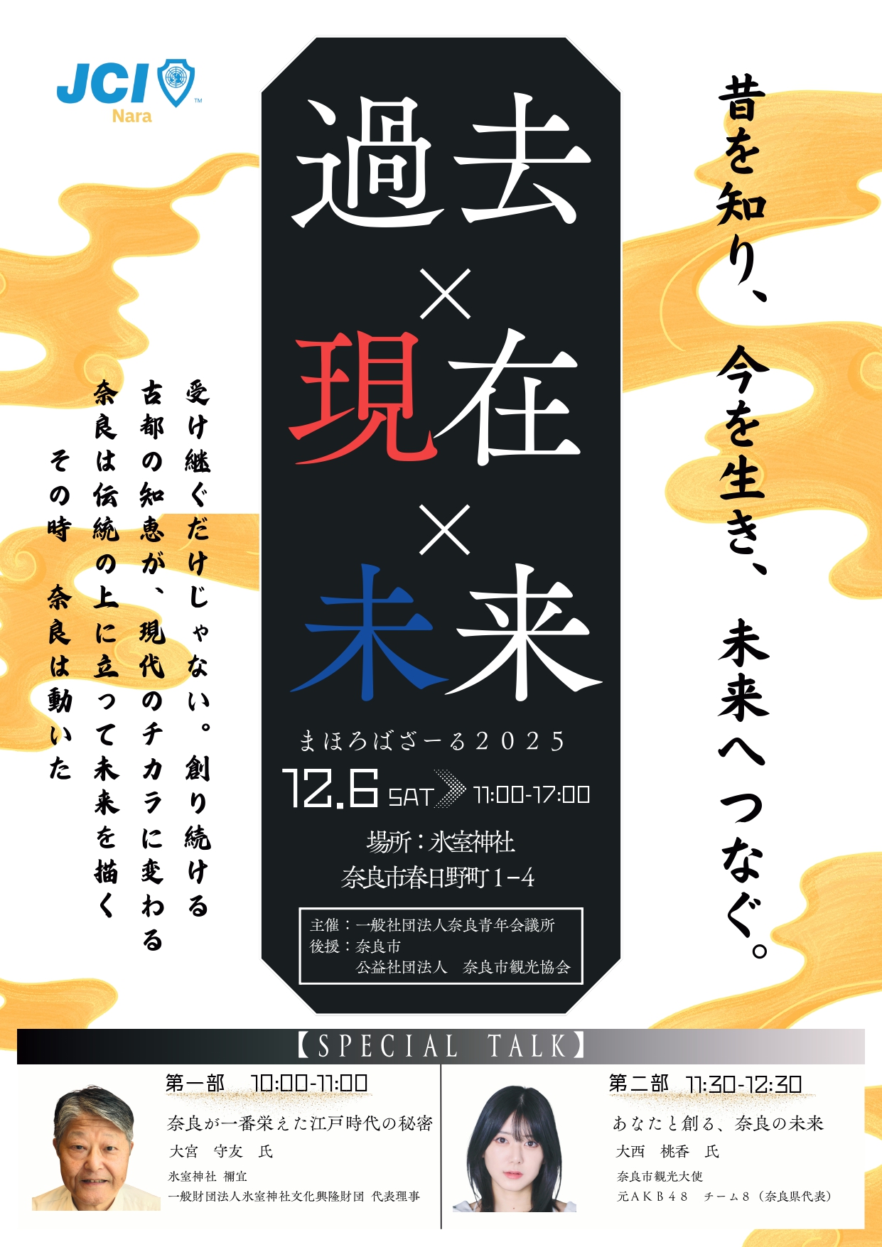 令和7年12月6日(土)に、奈良公園内の氷室神社と国立博物館西側にて、奈良のまちの未来を担う人づくりを目的に「まほろばざーる2025~そのとき奈良は動いた~」を開催します。