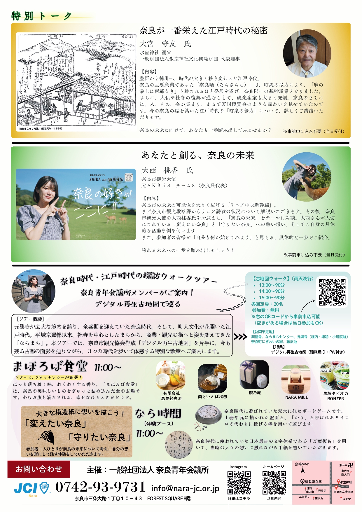 その後、奈良市観光大使・大西桃香氏と「変えたい奈良」「守りたい奈良」への熱い想いと具体的な行動を伺い、参加者が未来への一歩を踏み出すきっかけを提供します。
