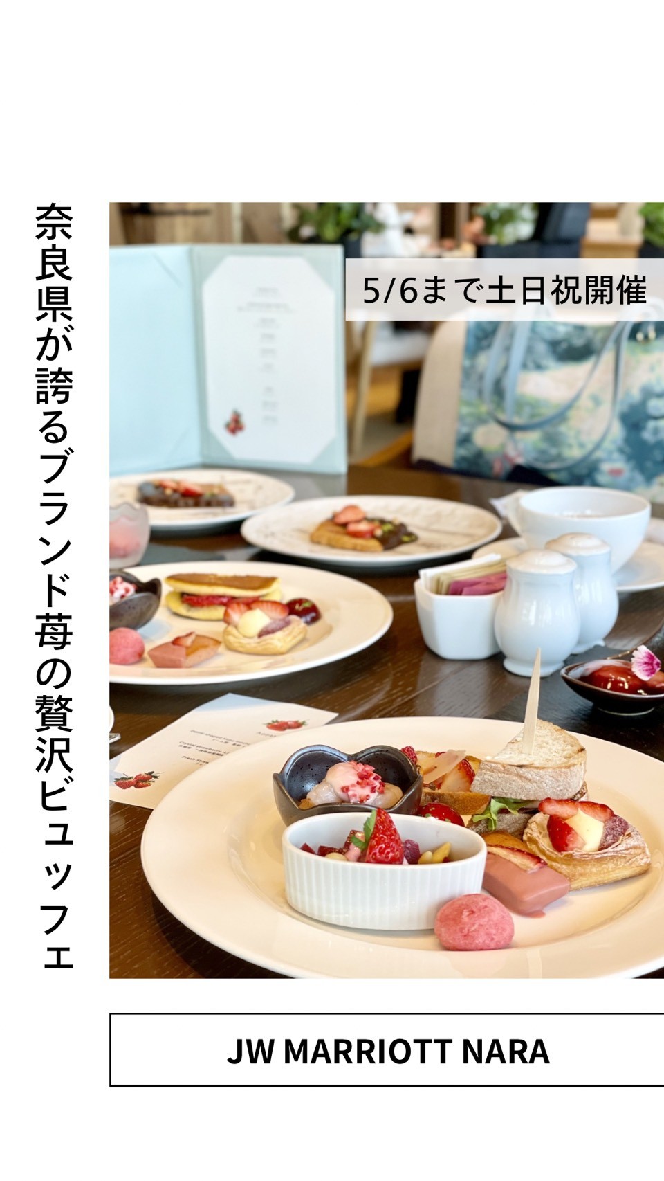 奈良県が誇るブランド苺「古都華」「奈乃華(なのか)」「あすかルビー」などを使用し、それぞれの個性を生かした約30品。スイーツだけでなくセイボリーメニューも充実しており、甘いものばかりで飽きることなく楽しめます✨
